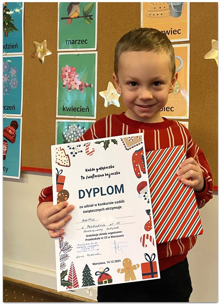 Olek z grupy Liski oraz Milan z grupy Sówki wzięli udział w śródmiejskim konkursie plastycznym pt. "Każda gałązeczka to świąteczna bajeczka" organizowanym przez Przedszkole nr 23.