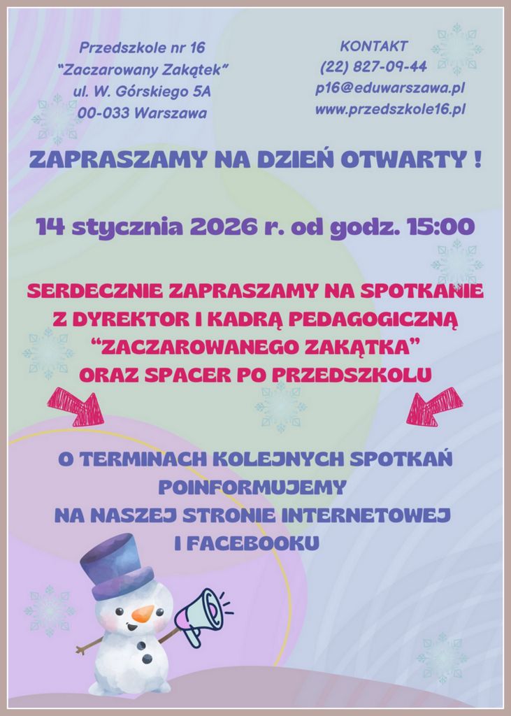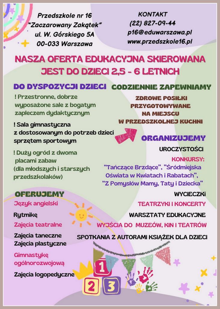 Śródmiejskie Przedszkole nr 16 „Zaczarowany Zakątek” to placówka z 67 letnią tradycją. Zlokalizowane jest w kwadracie ulic: Chmielna, Szpitalna, W. Górskiego, Nowy Świat.