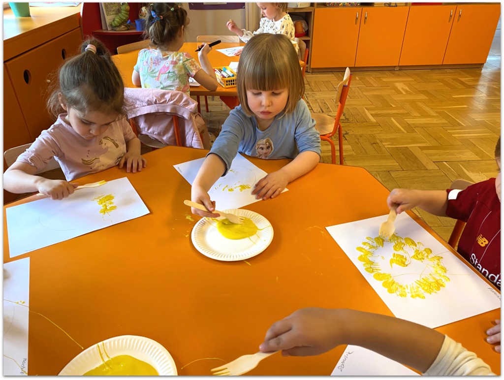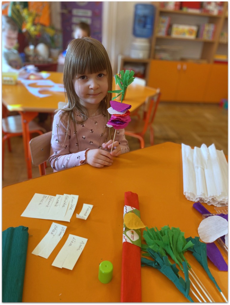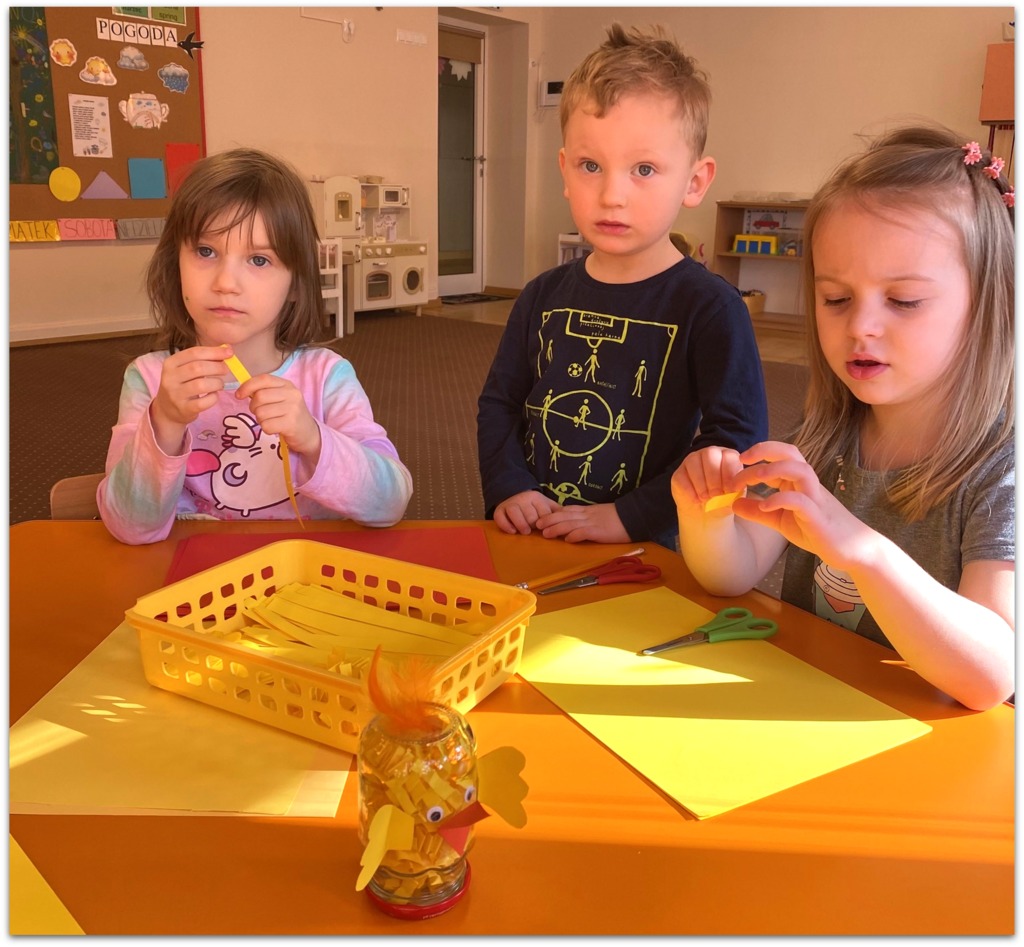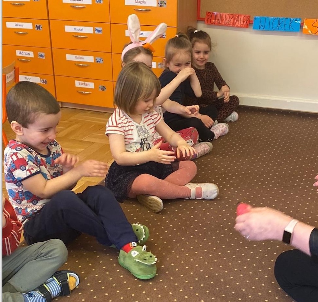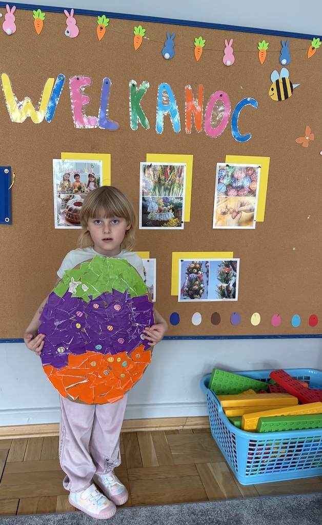 W czasie zajęć organizowanych przez nauczycielki poznają wielkanocne piosenki oraz polskie tradycje - np. wykonywanie palm wielkanocnych, ozdabianie jaj, śmigus - dyngus.