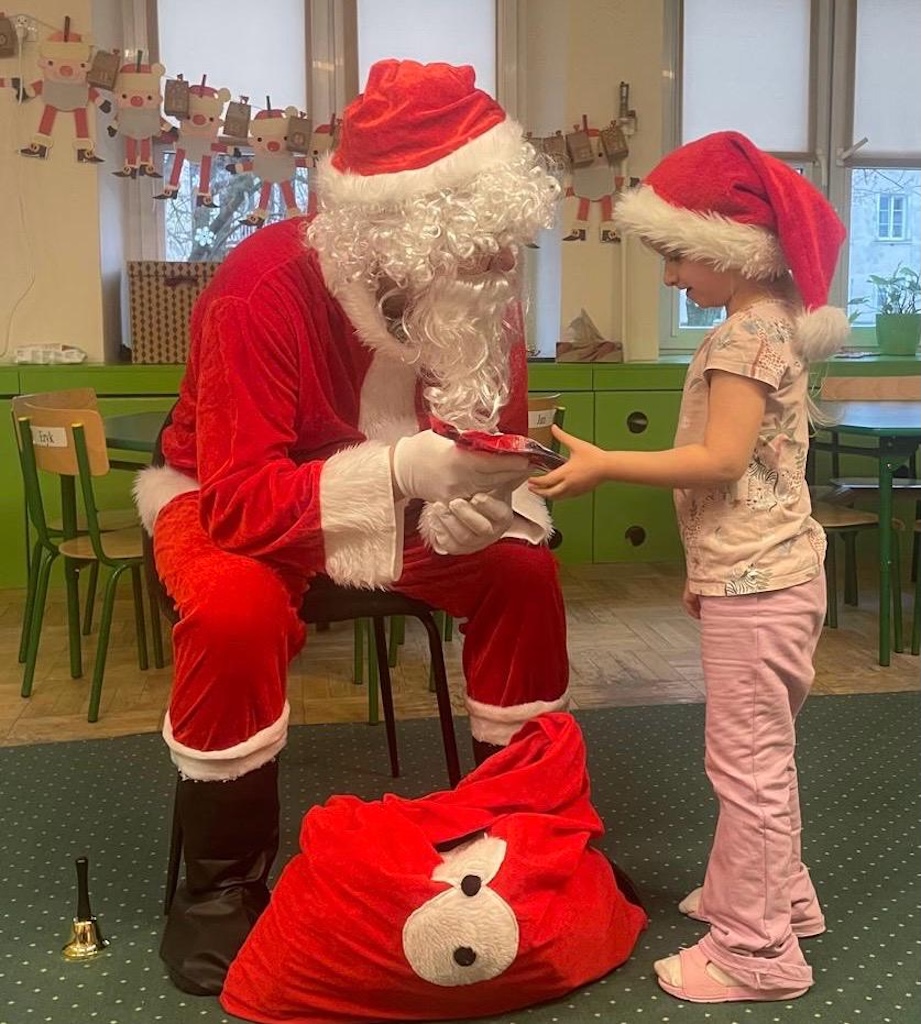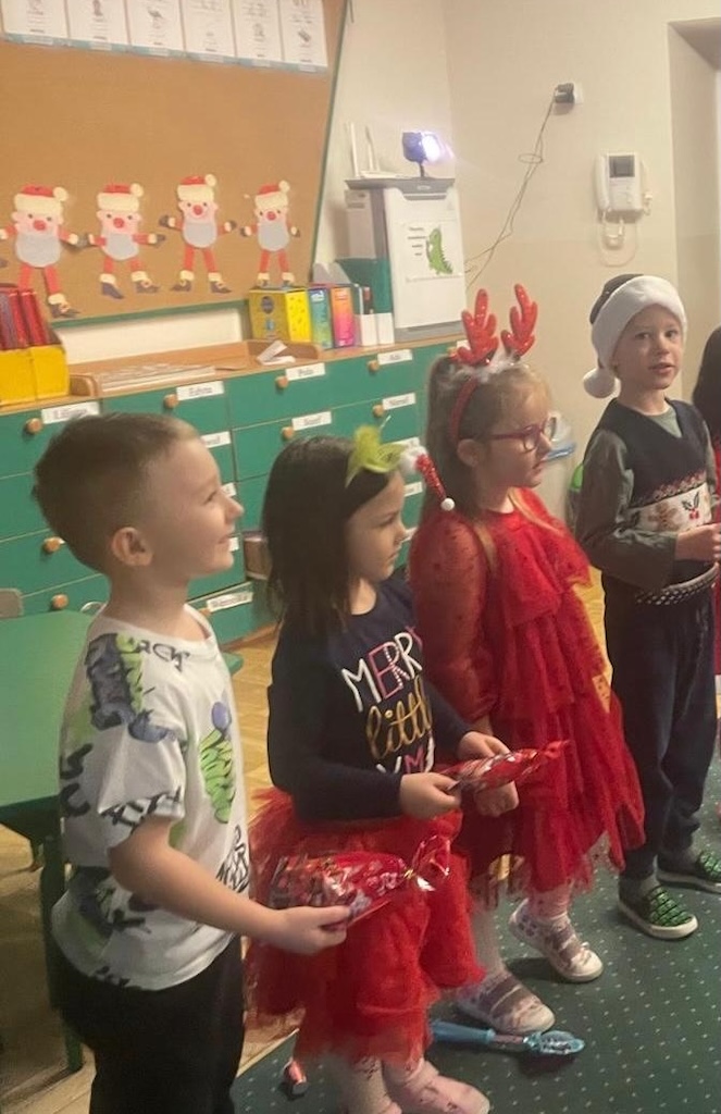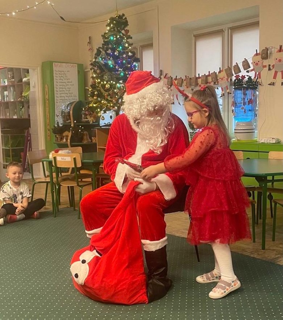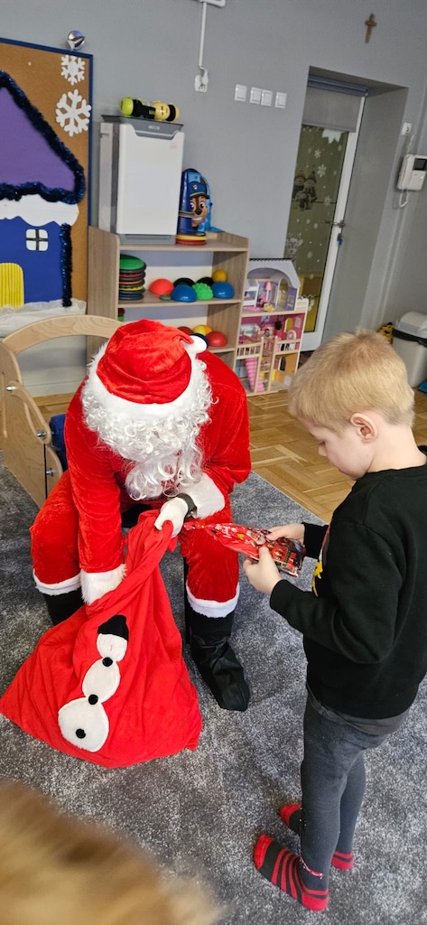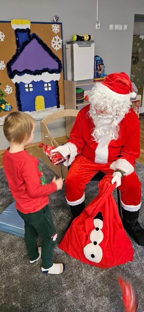 Dzieci z każdej grupy bardzo miło przywitały Gościa- zaśpiewały świąteczne piosenki, a Święty Mikołaj obdarował każdego drobnym prezentem.