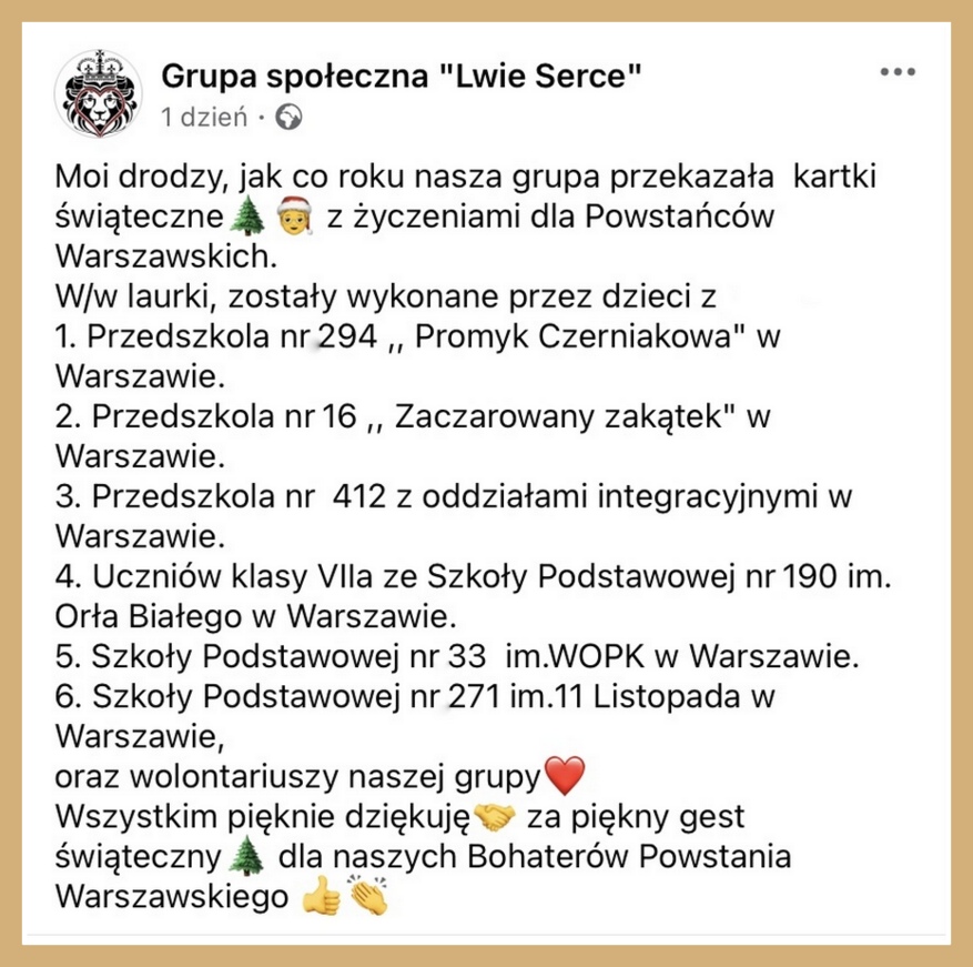 Nasze najstarsze Przedszkolaki z gr. Sówki wzięły udział w Akcji charytatywnej "Świąteczne życzenia dla Kombatanta" organizowanej przez Akcje Społeczne "Lwie Serce"