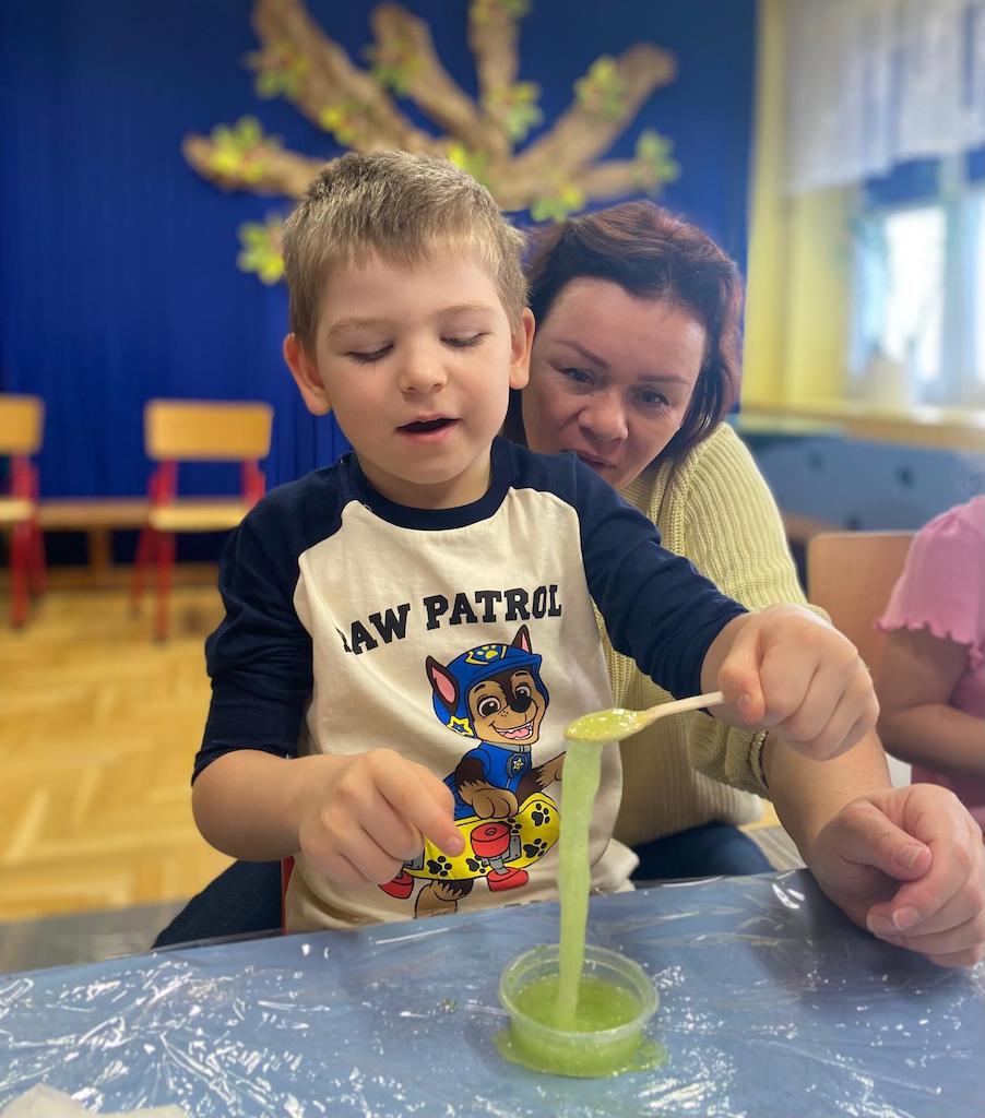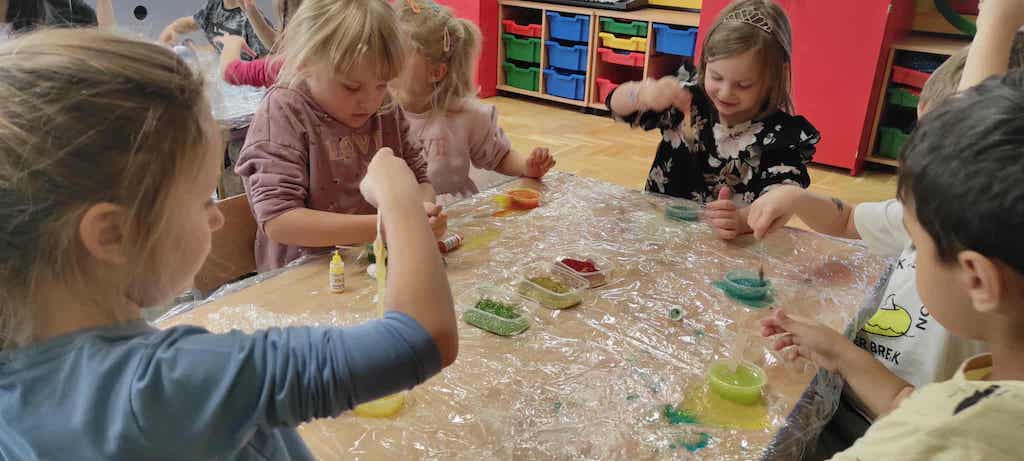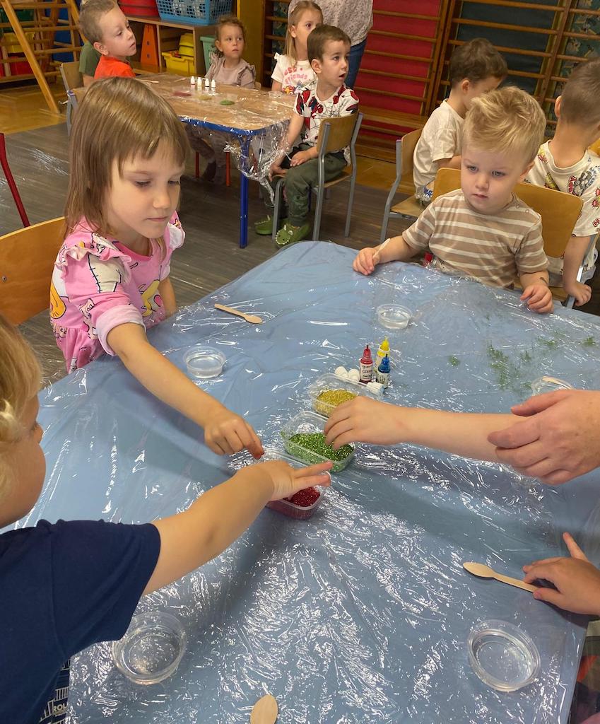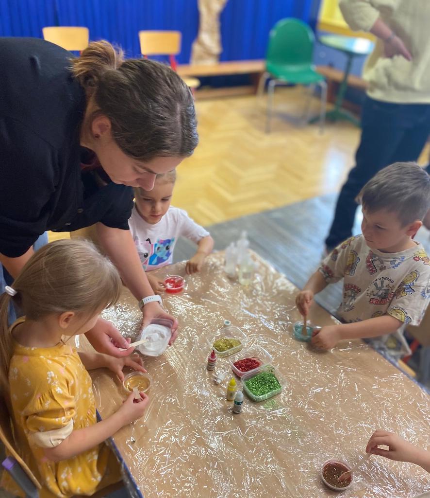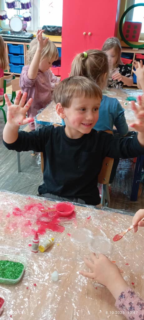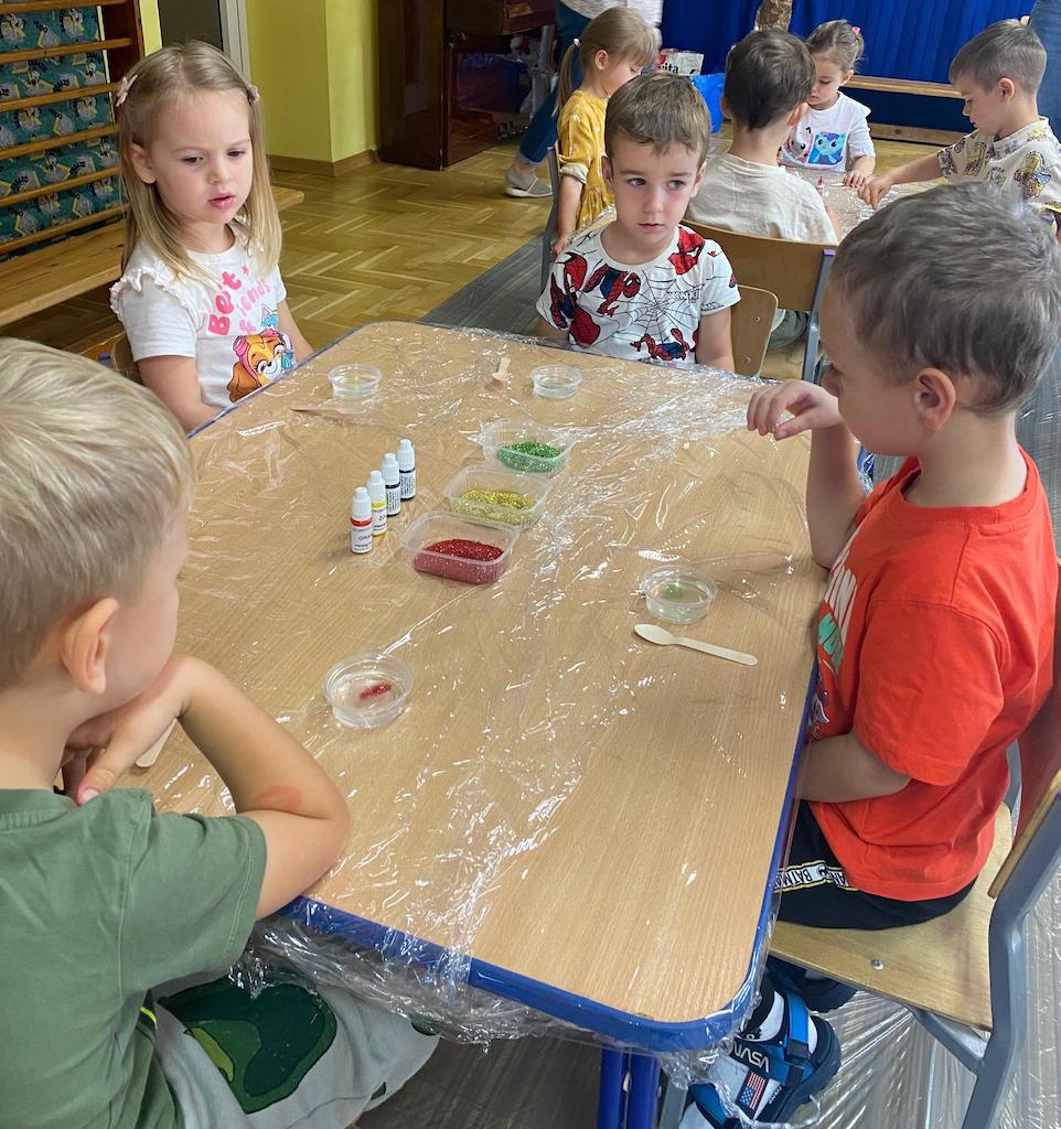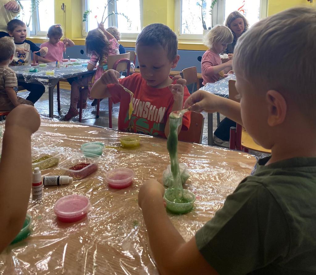 8 października dzieci ze wszystkich grup wzięły udział w warsztatach sensorycznych pt. "Masy plastyczne"- Tibidabu. Podczas zajęć każde z dzieci własnoręcznie wykonało slimy.