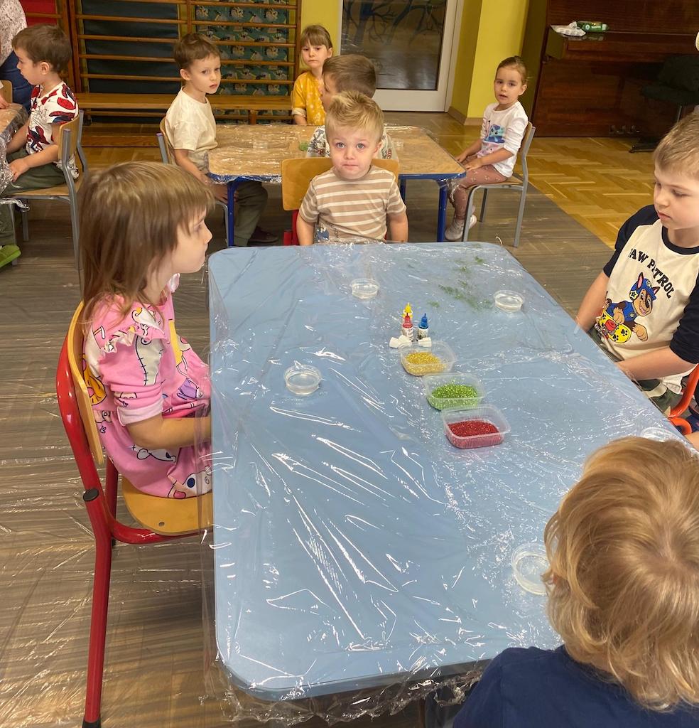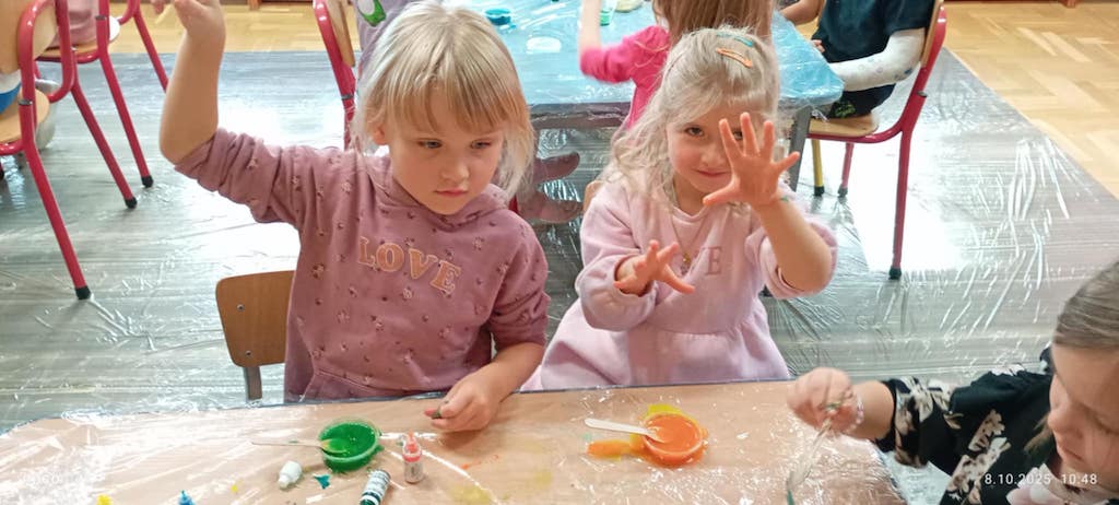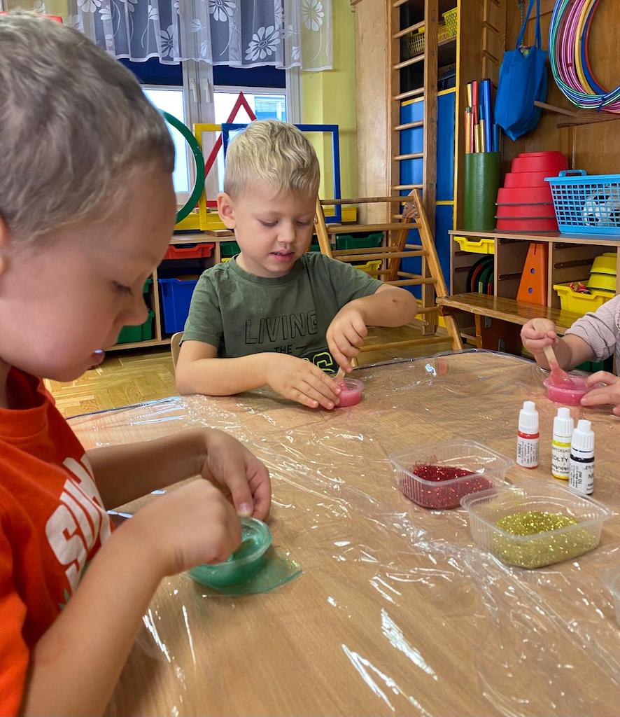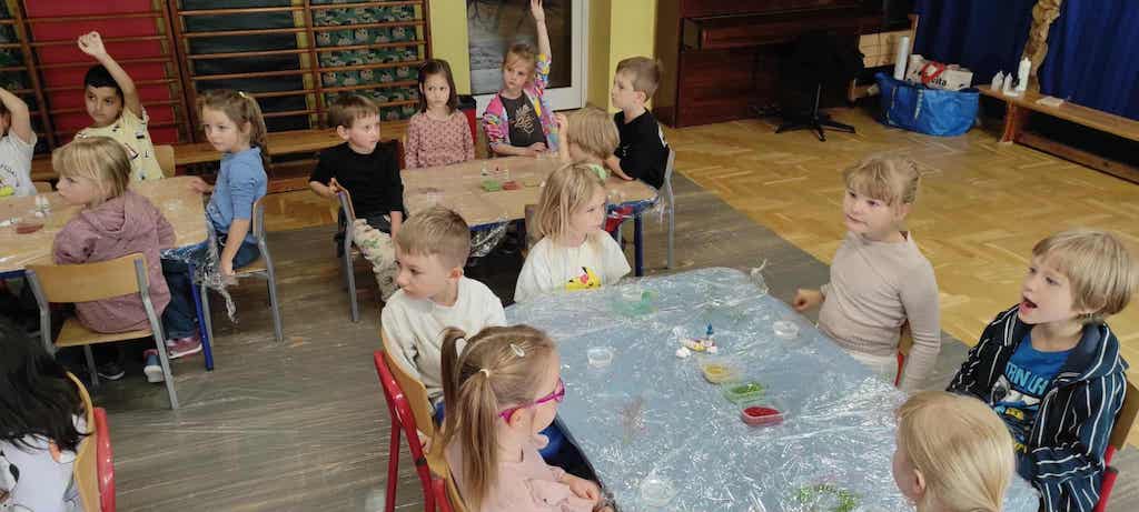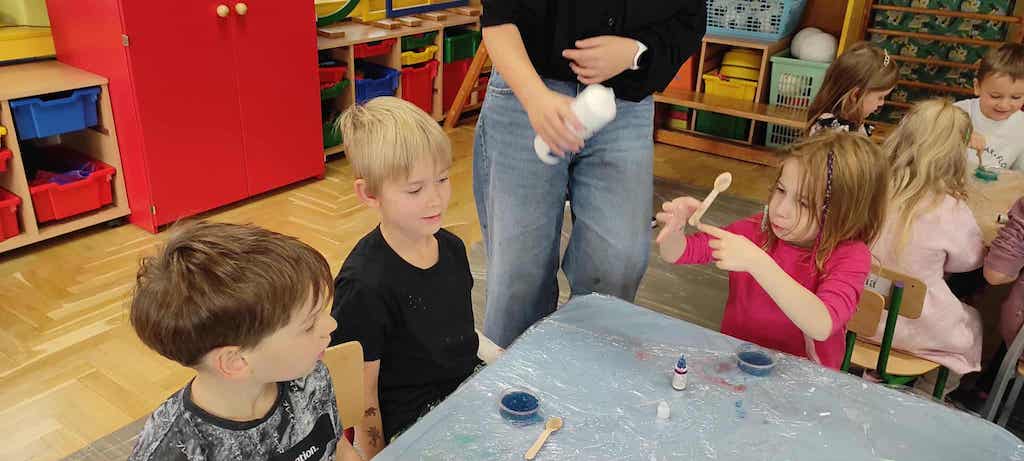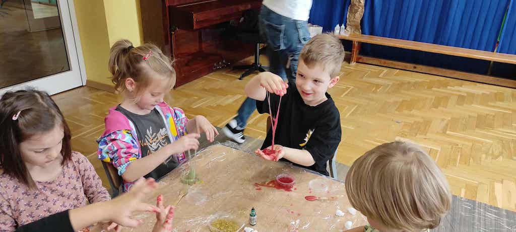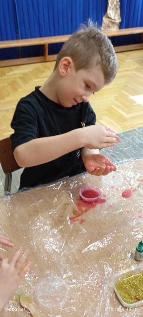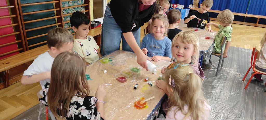 8 października dzieci ze wszystkich grup wzięły udział w warsztatach sensorycznych pt. "Masy plastyczne"- Tibidabu. Podczas zajęć każde z dzieci własnoręcznie wykonało slimy.